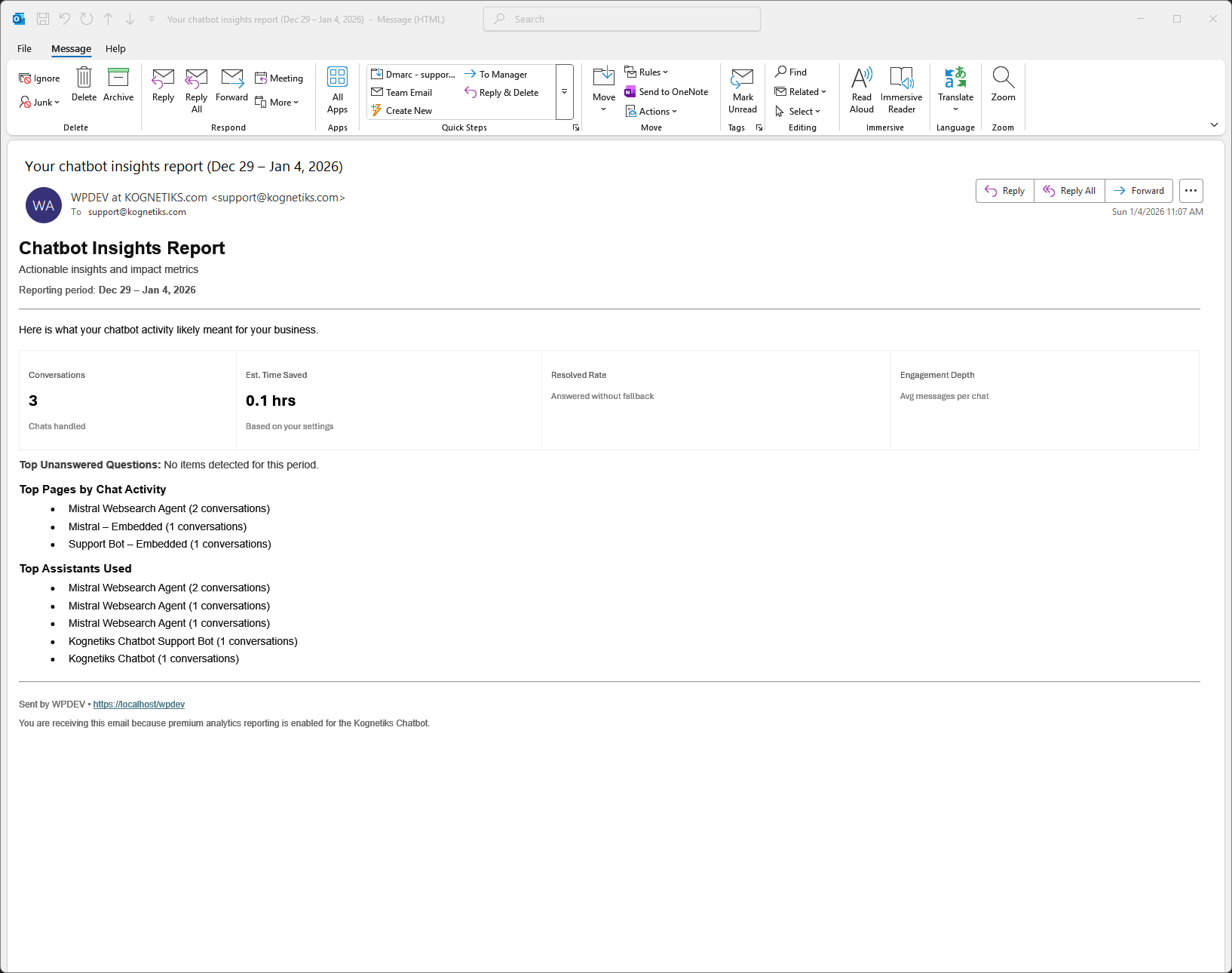 Kognetiks provides conversation digests and proof-of-value summaries so you can see usage patterns, intent, and engagement without reviewing every conversation.